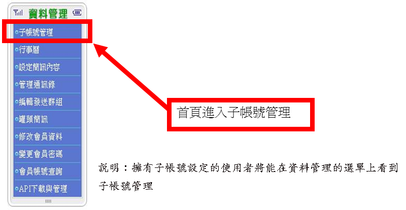 1.子帳號管理 : 一個帳戶管理者帳號,下面可建最少20個子帳號使用者,提供帳號與密碼管理及變更。 |