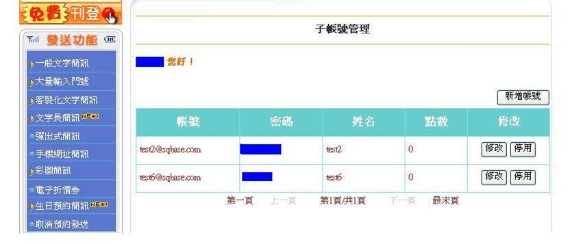 --子帳號管理介面 (子帳號管理介面,操作者能得知目前共有多少個子帳號與其剩餘點數,並可針對子帳號進行修改。) |