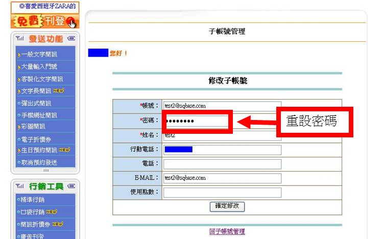 (2)修改子帳號(可修改子帳號資料/密碼重新設定與使用點數) | ||||||