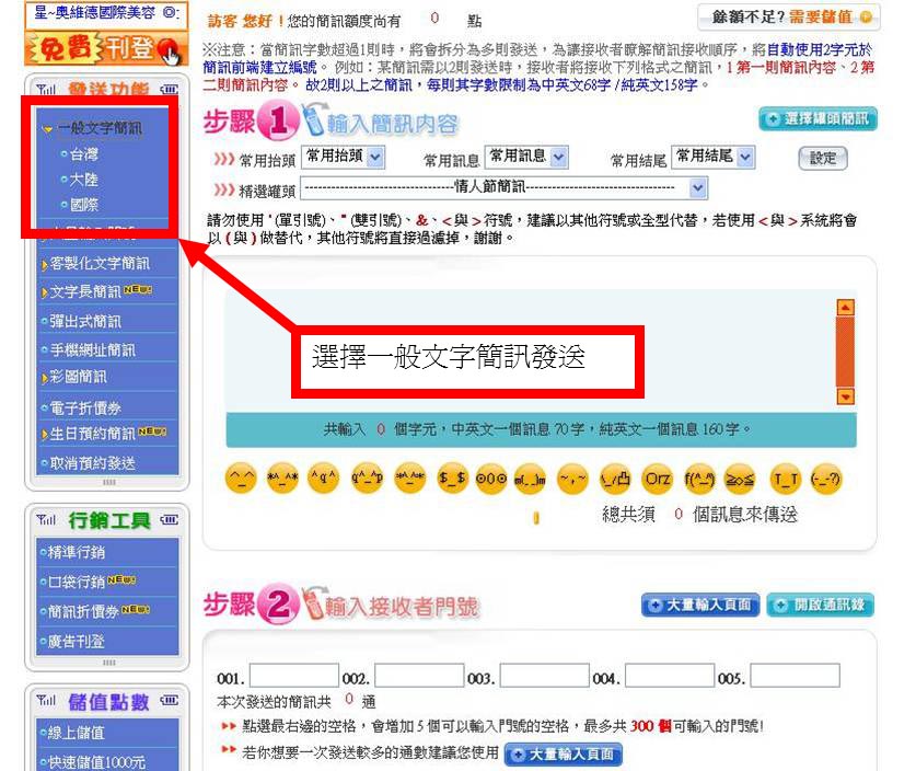 2.一般文字簡訊發送 → 相同內容,不同手機門號(少量) 時使用 |