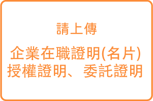 公司戶請上傳營業登記證/變更登記表,負責人或申請人身分證明文件影本,公司行號商業用途相關證明文件(企業在職證明(名片)、授權證明、委託證明(擇ㄧ)。